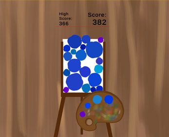 This is a game based on Suika (aka the Watermelon game). The idea of the game is to increase your score by combining paint balls of the same size . If your paintballs fall out of the canvas space, or are at rest above red line you drop them from you lose and all your paint will splat over the canvas ready for you to start again. If you manage to combine enough paintballs to make the biggest possible size of paintball it will splat giving you more room to continue.